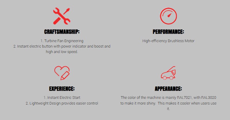 Dizajn lopatiek ventilátora: Aerodynamický dizajn lopatiek ventilátora zaisťuje efektívne vedenie prúdenia vzduchu, maximalizuje silu fúkania lístia a zlepšuje čistiaci účinok.