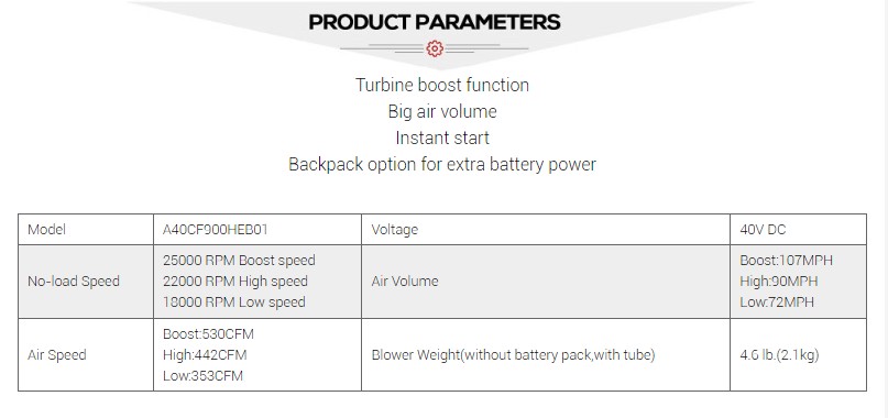 Technológia bezkomutátorového motora: Funkcia turbodúchadla dúchadla lístia s lítiovou batériou využíva efektívnu technológiu bezkomutátorového motora, ktorá poháňa turbo ventilátor vysokou rýchlosťou, aby sa vytvoril silný prúd vzduchu.