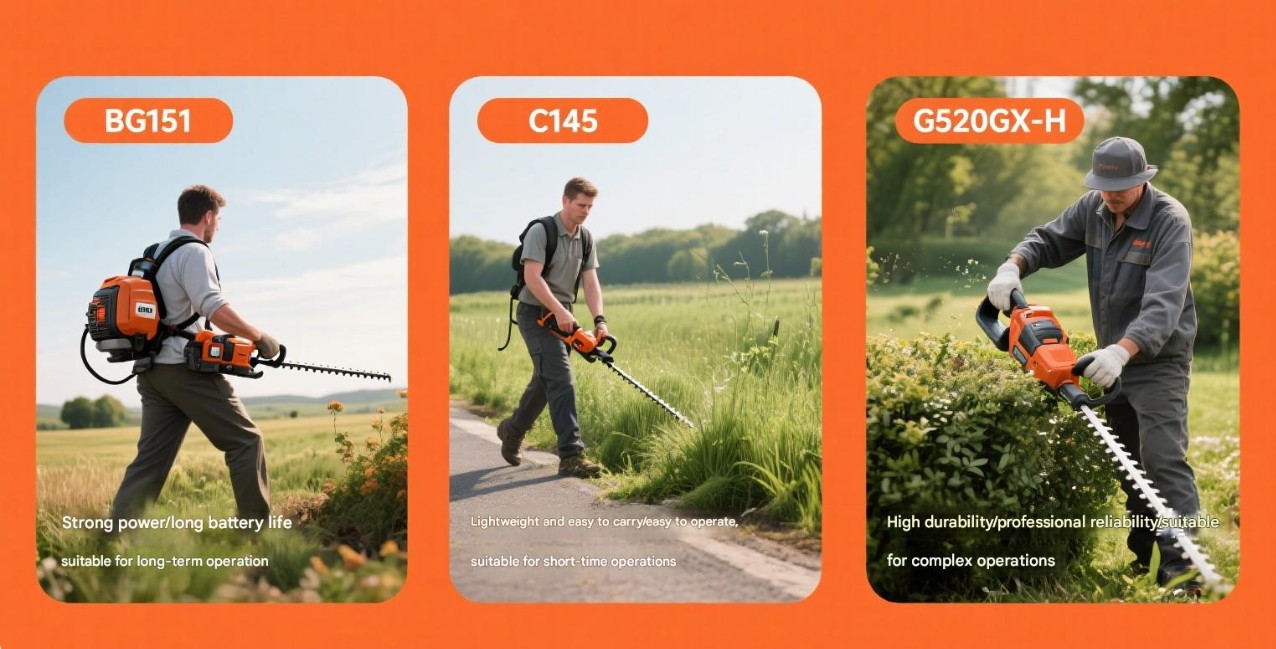 Domáci používatelia: Pre domácich používateľov si môžete vybrať ľahké a ľahko prenosné ručné kosačky, ako napríklad krovinorez CG145 a krovinorez CG430B. Tieto modely sa ľahko ovládajú a sú vhodné pre domácich používateľov na vykonávanie každodenných prác na údržbe záhrady.
