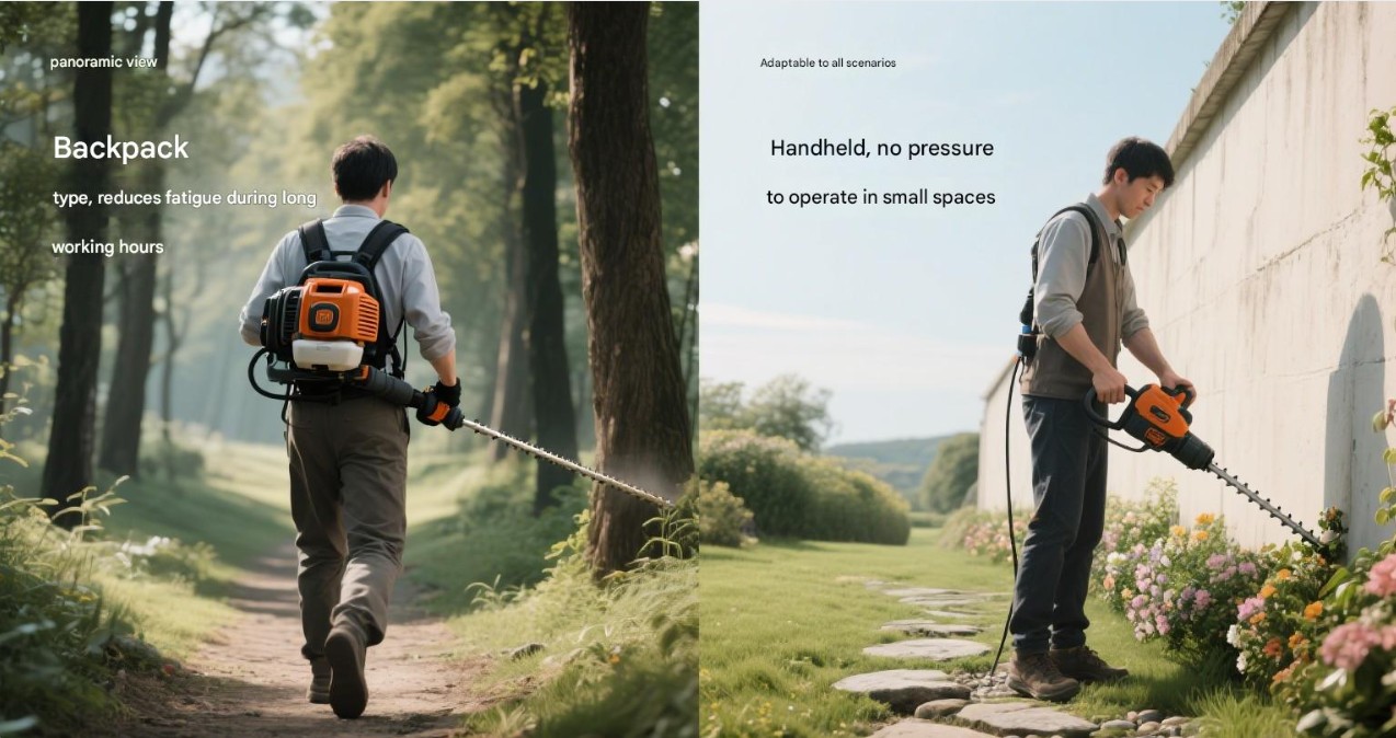 Batohový a ručný dizajn: Benzínový krovinorez zvyčajne obsahuje dva dizajny, batoh a ručný, ktoré sa dokážu prispôsobiť rôznym pracovným prostrediam. Dizajn batohu je vhodný na orezávanie veľkých plôch a zložitých terénov, zatiaľ čo ručný dizajn je vhodný na orezávanie malých záhrad a buriny pri cestách.