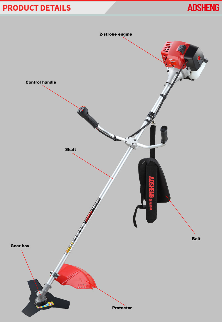 Profesionálny motor, sila výkon. nízka spotreba, ľahké štartovanie. Otáčanie o 360° Pohodlná ovládacia rukoväť a špongiový pás. Vyžínacia hlava môže ponúknuť šírku rezu 460 mm. priemer čepele...