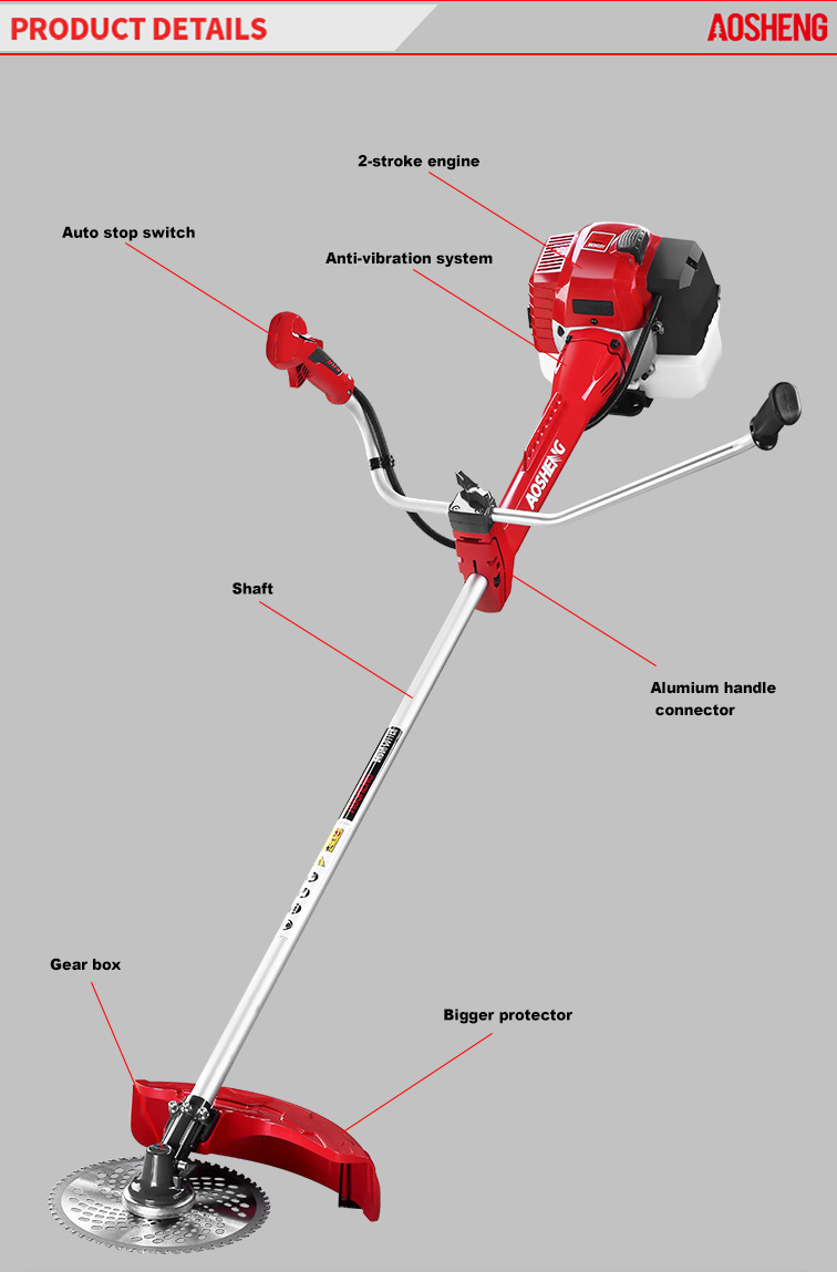 Profesionálny motor, sila výkon. nízka spotreba, ľahké štartovanie. Otáčanie o 360° Pohodlná ovládacia rukoväť a špongiový pás. Vyžínacia hlava môže ponúknuť šírku rezu 460 mm. priemer čepele...